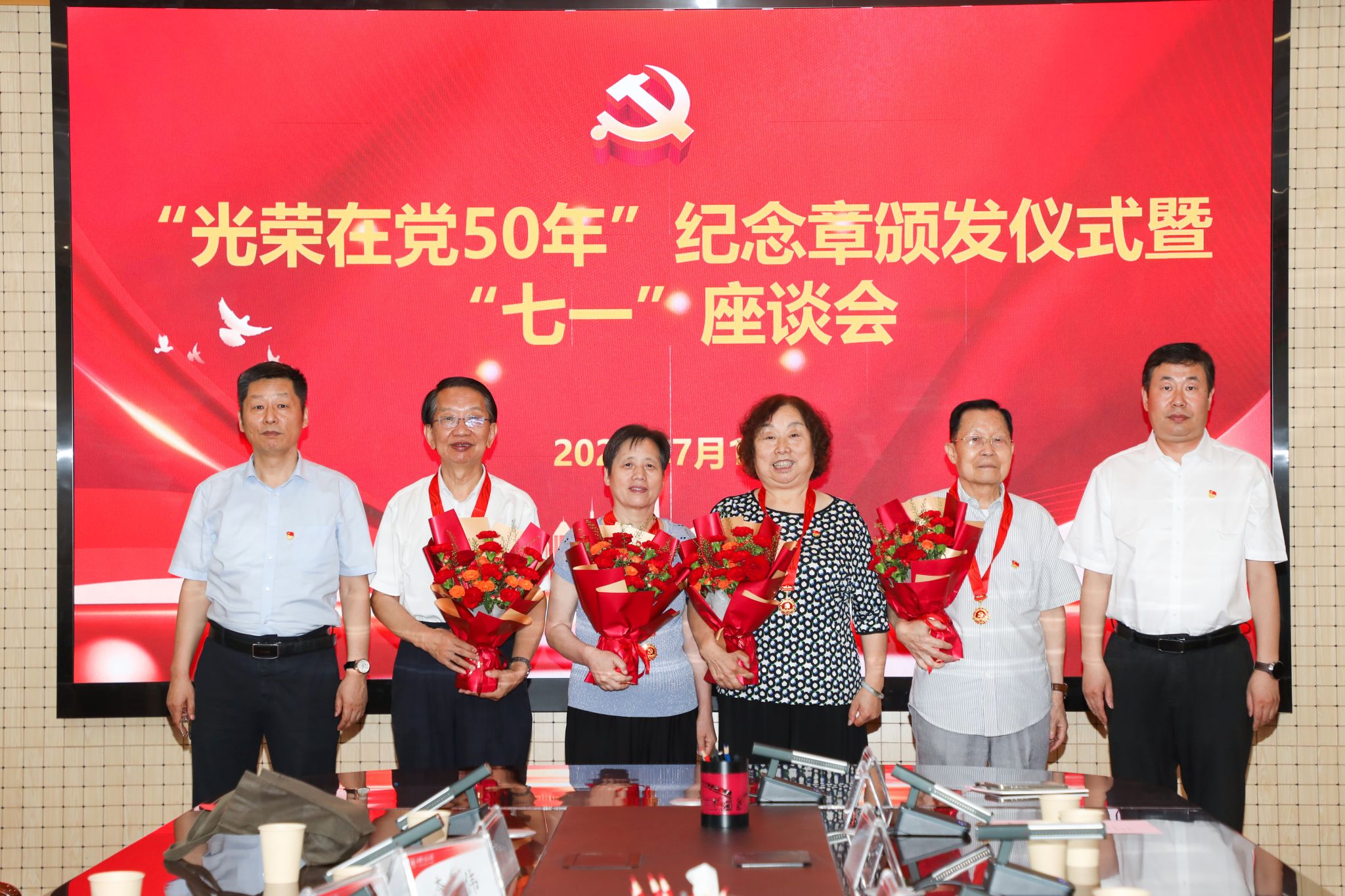 7月1日下午,beat365在金花校区第三会议室举办“光荣在党50年”纪念章颁发仪式暨“七一”座谈会。校党委副书记、纪委书记、监察专员辛永昌,党委副书记殷永建出席会议并讲话。会议由校党委委员、组织部部长黄海峙主持,党委相关职能部门负责人、部分院(部)级党组织书记、“光荣在党50年”老党员、师生党员代表参加会议。