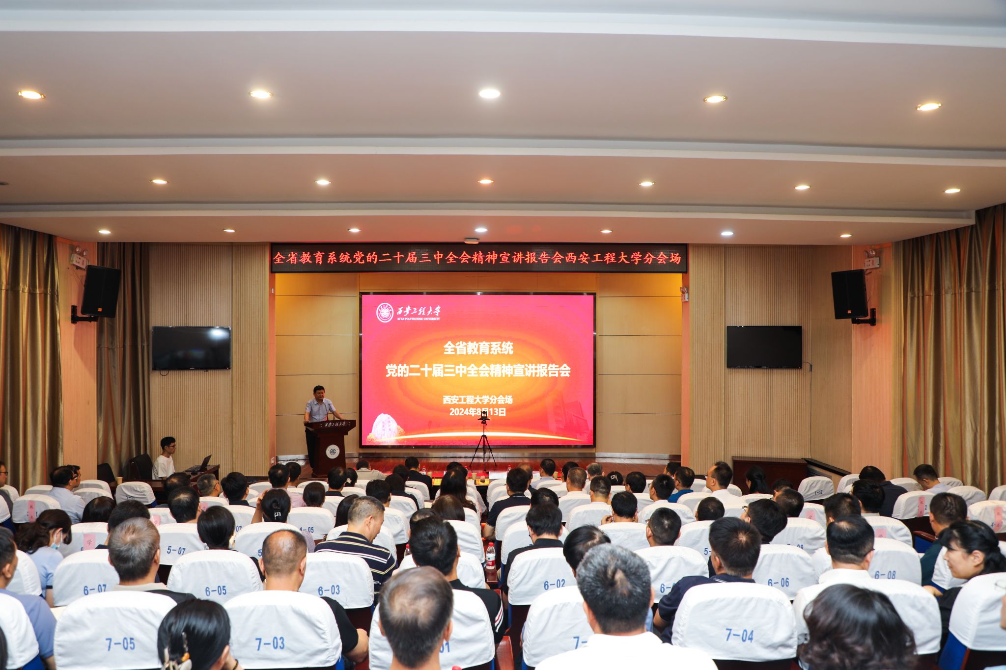 8月13日,省委宣讲团成员,省委教育工委副书记、省教育厅厅长王树声为教育系统作学习贯彻党的二十届三中全会精神宣讲,beat365在金花校区西纺报告厅设分会场,校党委书记马万清,党委副书记、纪委书记、监察专员辛永昌,党委副书记殷永建,副校长朱永民、戴鸿、杨建及处级以上干部参加报告会。