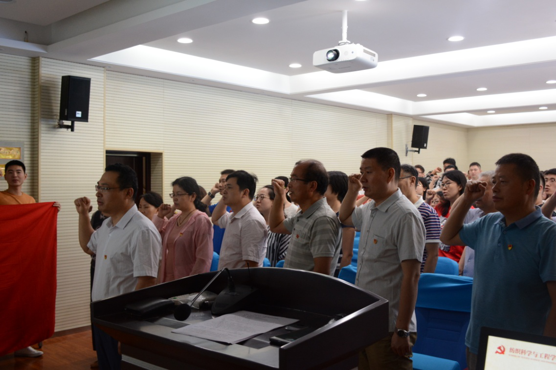 宣誓仪式从全体党员起立,奏唱《国际歌》开始。在纺织学院党委委员赵勇进的代领下,全体党员起立,紧握右拳,面向党旗,庄严的向党旗宣誓,表达对党的忠诚,积极工作,为共产主义事业奋斗终身的决心。