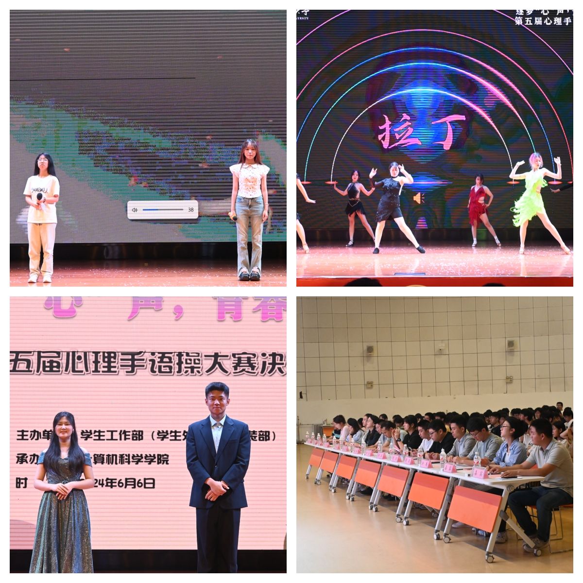 6月6日晚,由校学生工作部主办、计算机科学学院承办的第五届“逐梦‘心’声,青春护航”心理手语操大赛决赛在临潼校区大学生活动中心举办。校学生工作部部长王志、计算机学院党委副书记赵勇进出席活动,校大学生心理健康教育与咨询中心马海蓉、电信学院曹智宇、城市学院王春元、人文学院刘杨扬、管理学院姚壮、环化学院任子瑜、机电学院李菁菁、新媒体学院宾田田以及计算机学院相关辅导员担任大赛评委,计算机学院2023级本科生及各支参赛队伍的亲友团到场观看了比赛。