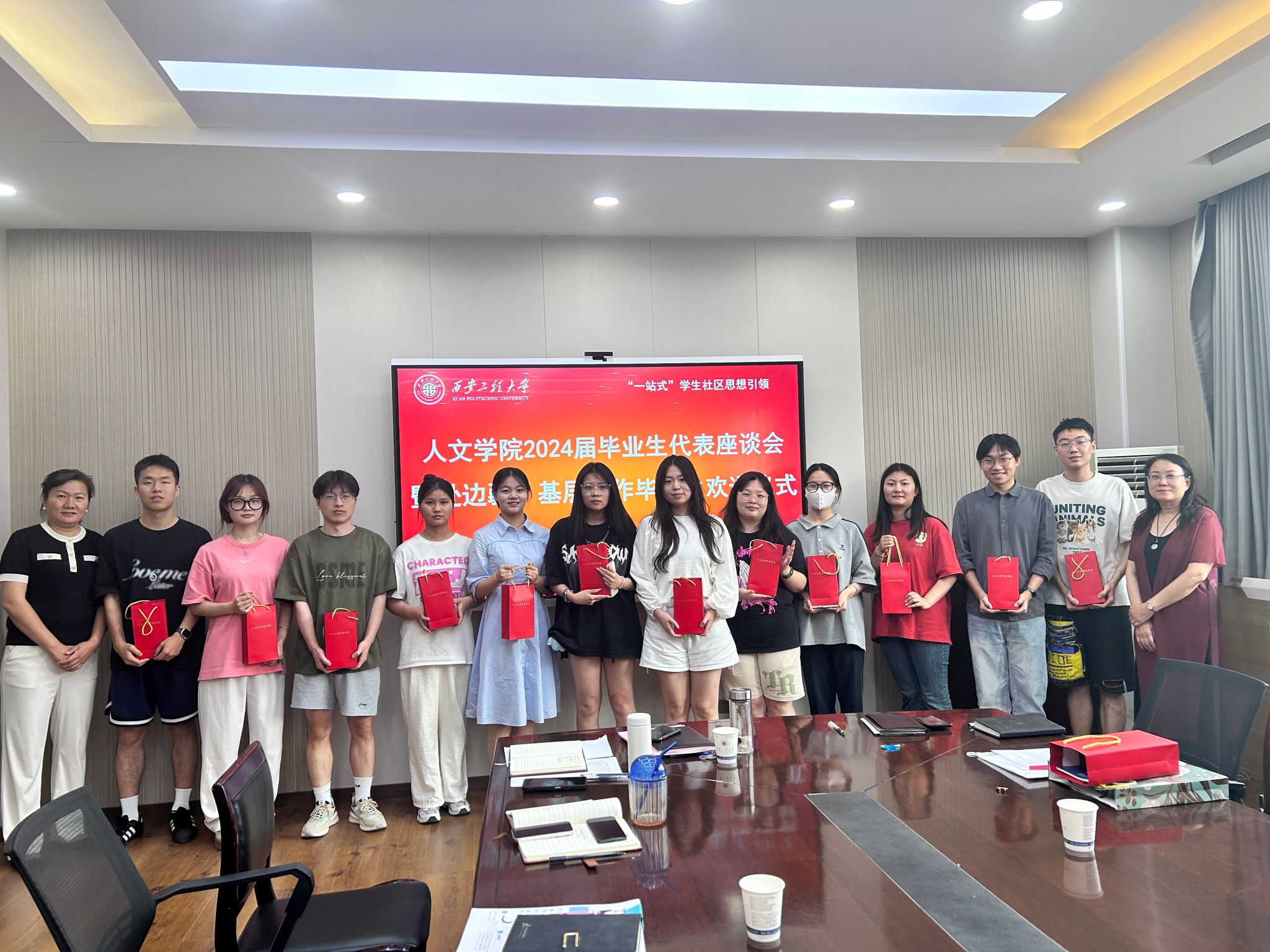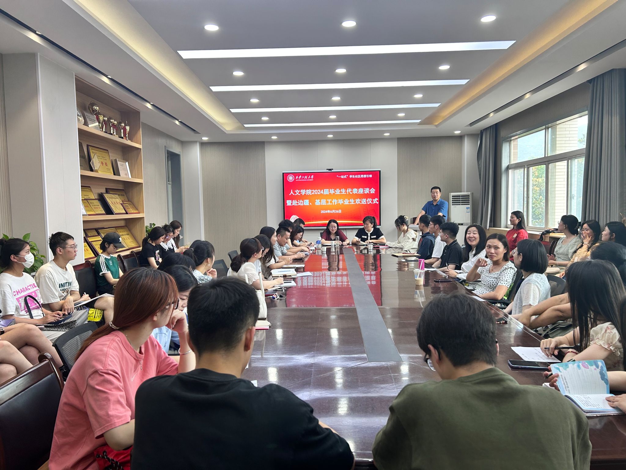 青春似火,岁月如歌。在这繁花似锦的时节,人文社会科学学院2024届毕业生即将踏上人生新征程,书写人生新篇章。6月26日下午,学院召开“一站式”学生社区“思想引领”之——2024届毕业生代表座谈会暨赴边疆、基层工作毕业生欢送仪式。人文学院党政领导、院办主任、系(部)主任、研究生学位点负责人、研究生秘书、教务员、全体辅导员、赴边疆工作毕业生及部分毕业生代表齐聚学院326会议室,共话成长,共绘未来。会议由学院党委副书记赵立涛主持。