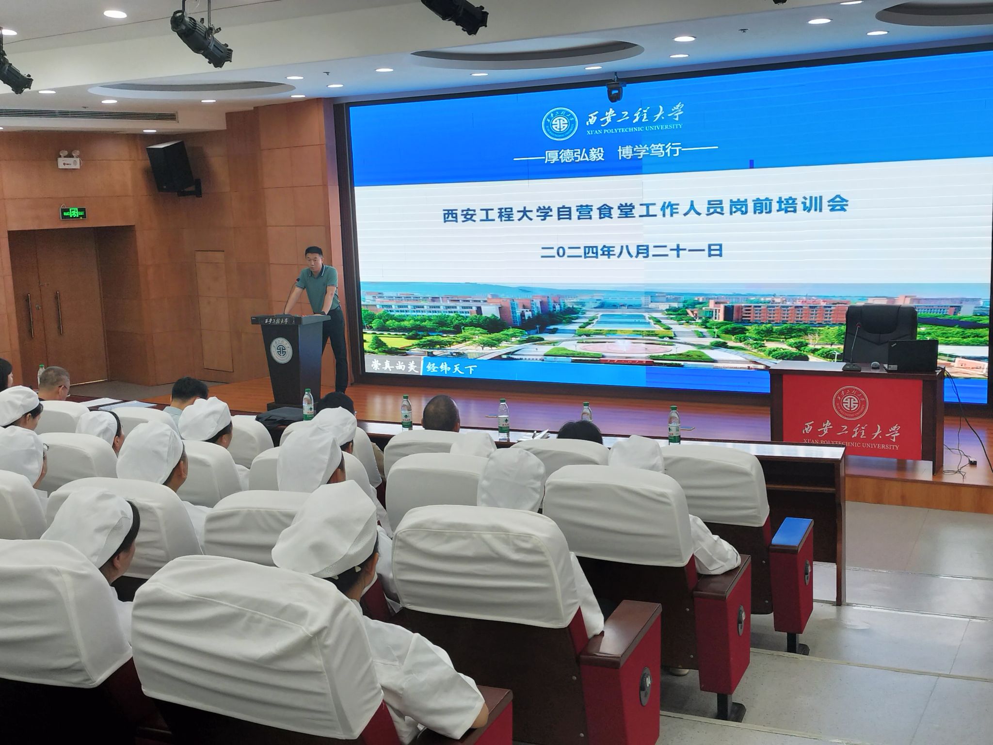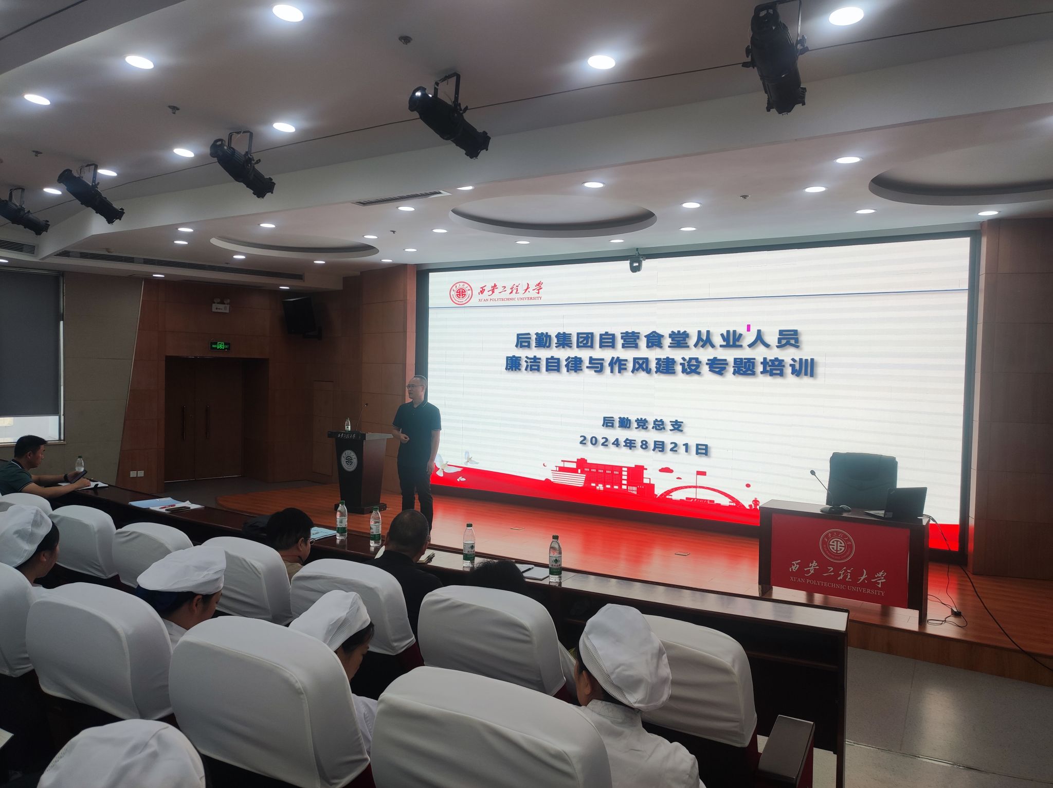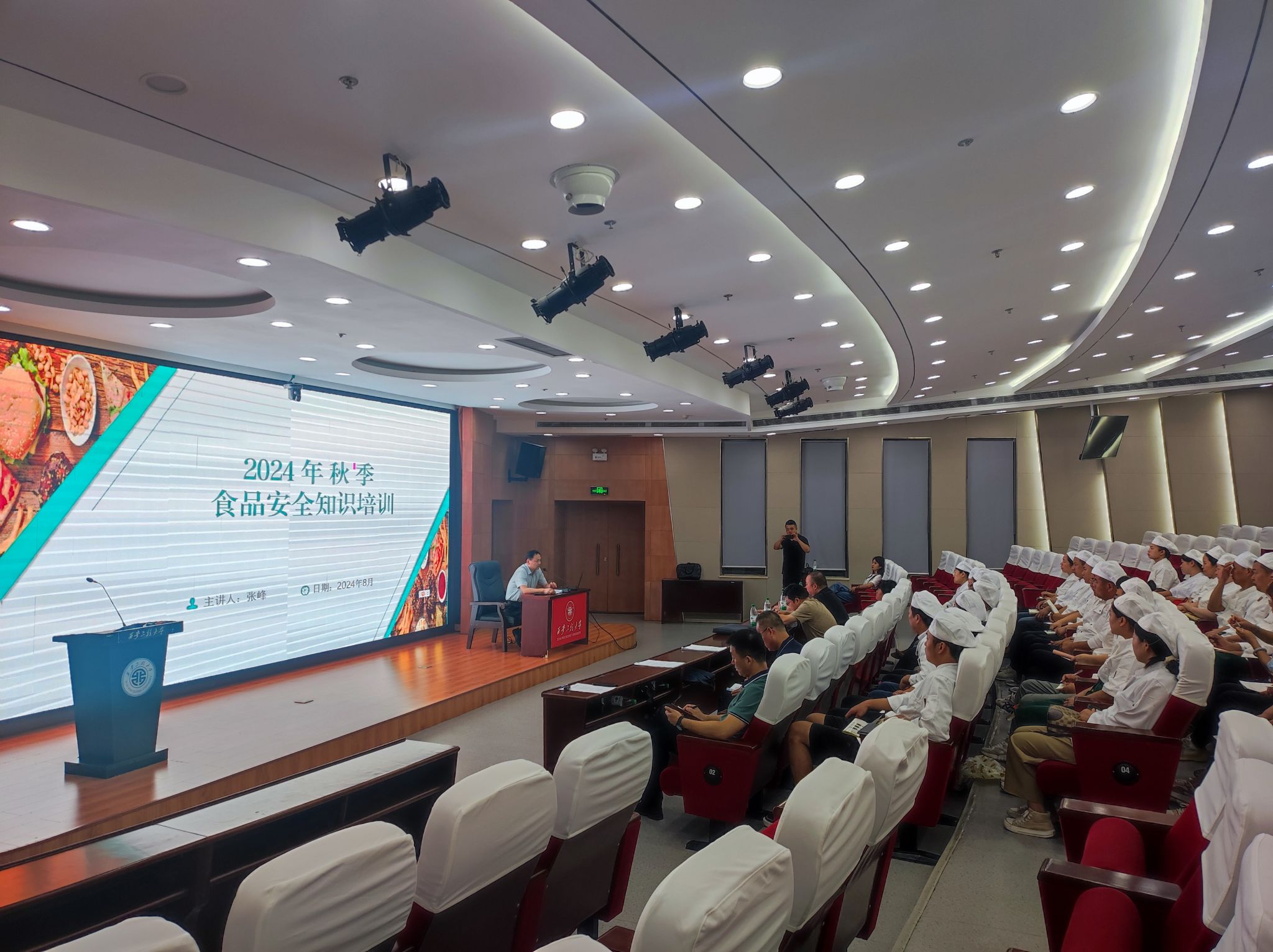 开学在即,为落实落细上级主管部门相关政策要求和学校党政关于自营食堂有关的重要决策部署,同时,为进一步提高beat365食堂食品安全保障能力,提升自营食堂工作人员团队凝聚力,确保学校三个自营食堂顺利开办,保障秋季开学正常供餐。8月21日上午,后勤管理处(集团)在临潼校区图书馆一层报告厅组织开展自营食堂从业人员岗前培训暨2024年度秋季开学食品安全专题培训,后勤管理处(集团)党总支书记杨森,处长张峰,餐饮管理服务中心全体人员、综合办公室工作人员、自营食堂新聘管理人员及档口代表、餐饮公司代表等共计70余人参加了培训,培训会议由餐饮管理服务中心副经理郭凯杰主持。
