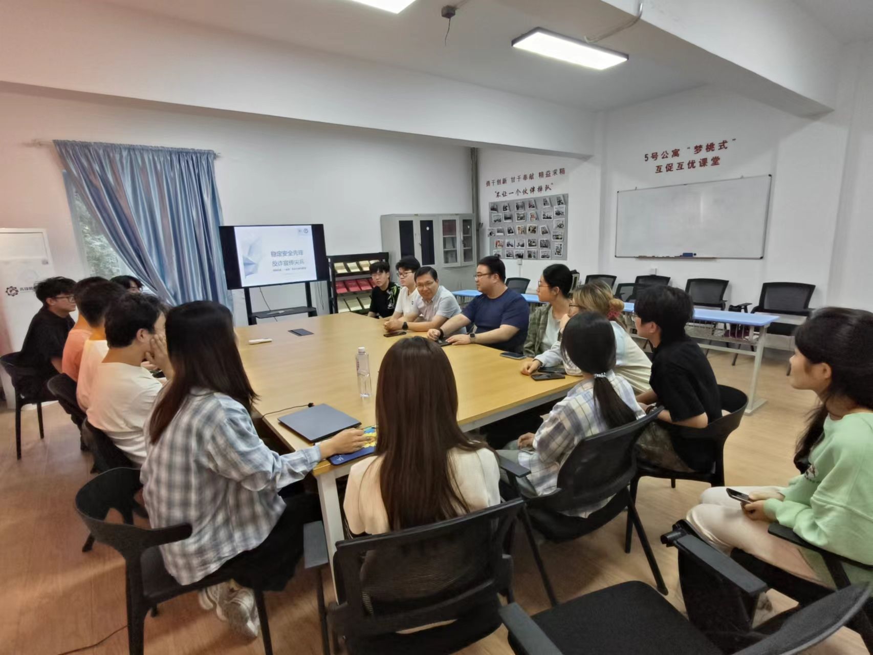 为深入贯彻落实国家网络安全宣传周活动宗旨,充分发挥网络思想主阵地的引领示范作用,机电工程学院组建了beat365首支大学生反诈防骗宣传团队,并于9月23日在“一站式”学生社区举办题为“稳定安全先锋,反诈宣传尖兵”的座谈会,校稳定办主任兼党政办副主任李喜峰、机电工程学院党委副书记冯翊、辅导员曹尚桥和先锋机电“一站式”反诈小剧社成员参加了座谈会。