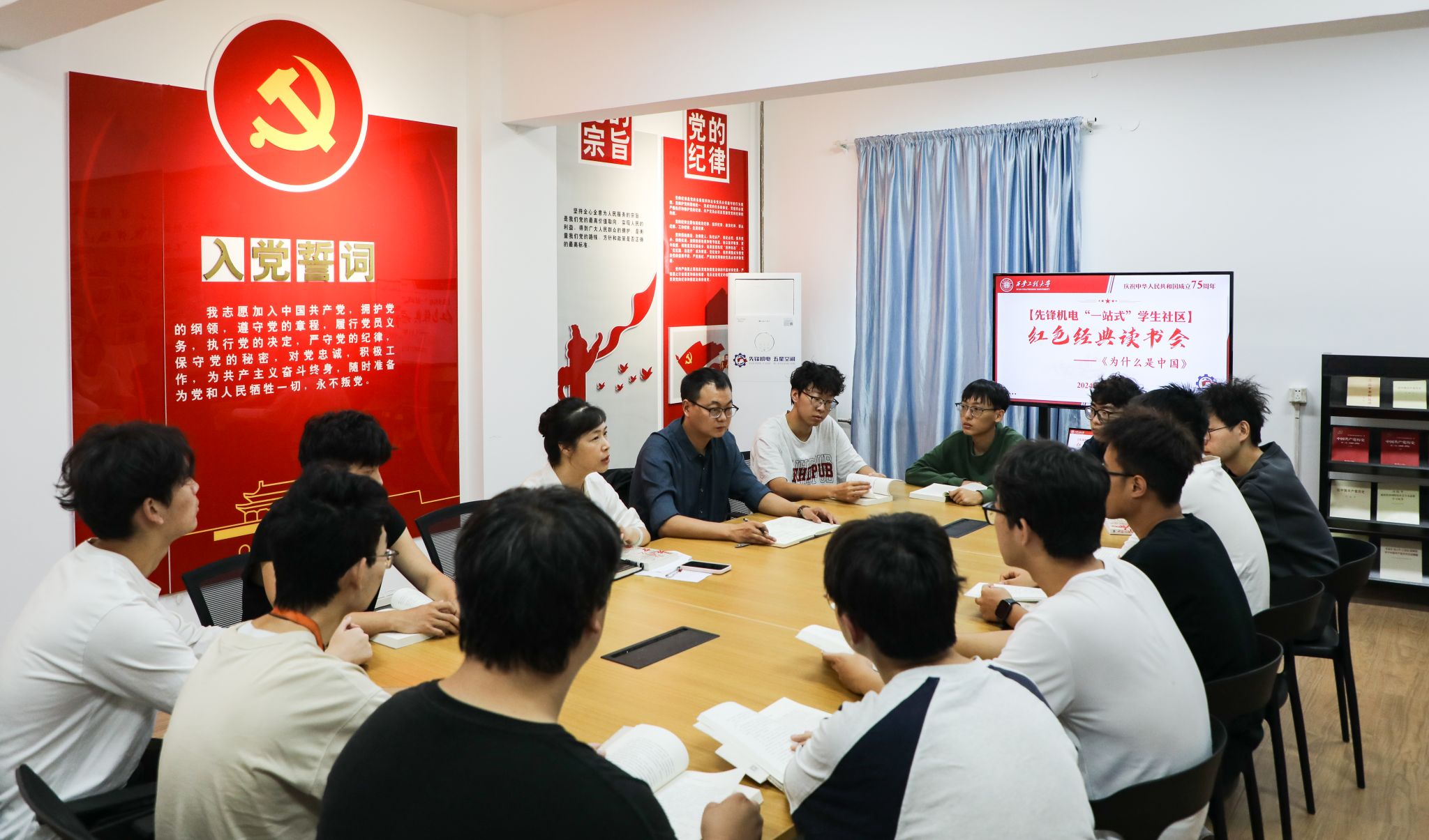 9月27日上午,校党委宣传部深入“先锋机电五星空间”党建引领“一站式”学生社区开展结对共建,举办红色经典读书会活动。党委宣传部部长王鸣媛出席活动,机电工程学院学生第三党支部书记秦方刚和部分本科生参加活动。