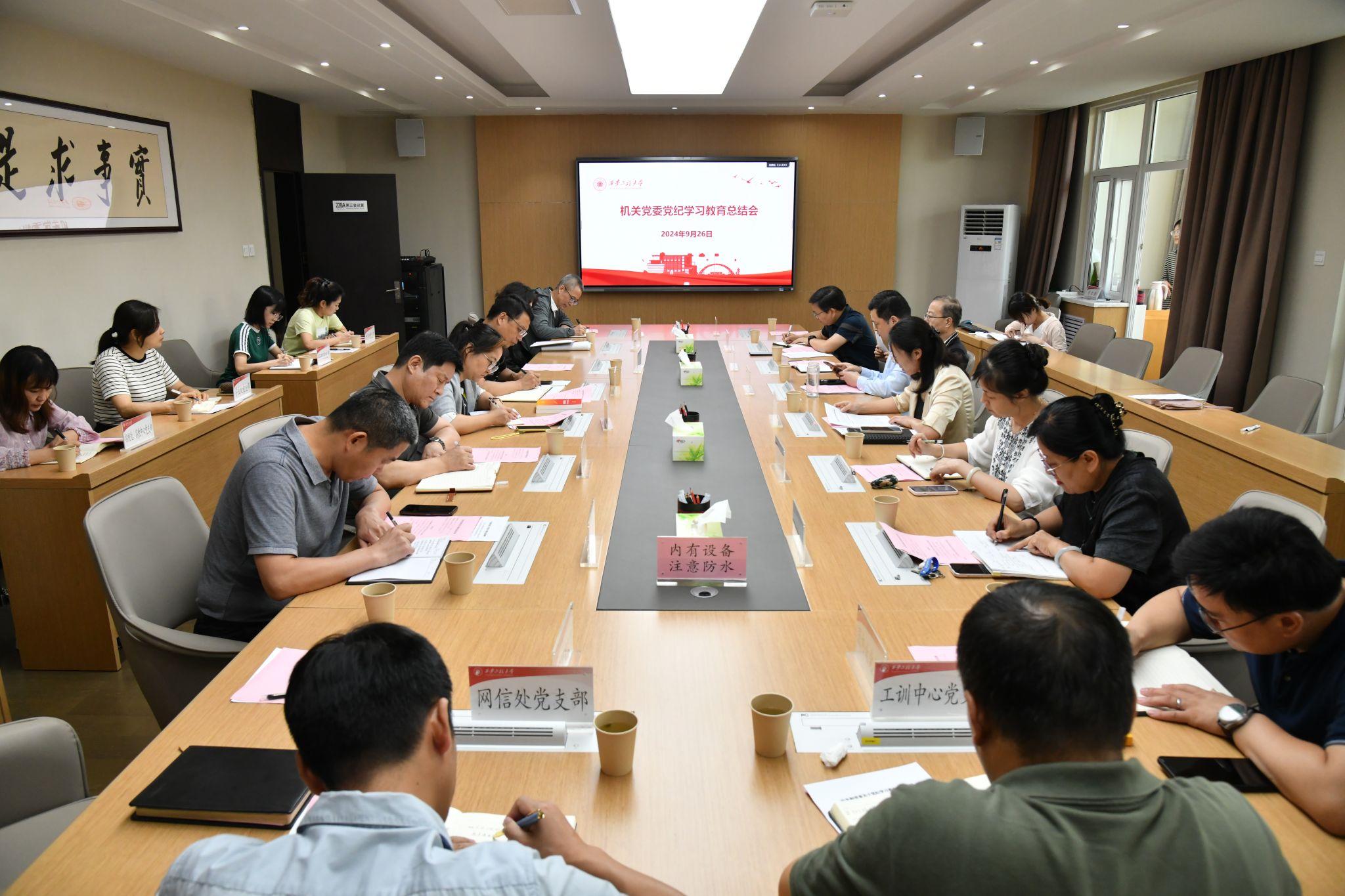9月26日下午,机关党委在临潼校区行政楼第三会议室召开党纪学习教育总结会,深入学习贯彻习近平总书记对党纪学习教育重要指示及中央党的建设工作领导小组会议精神,对机关党纪学习教育进行总结,着力把党纪学习教育成果持续转化为推动机关党建高质量发展的强大动力。机关党委委员、各党支部书记参加会议,会议由机关党委书记胡小进主持。