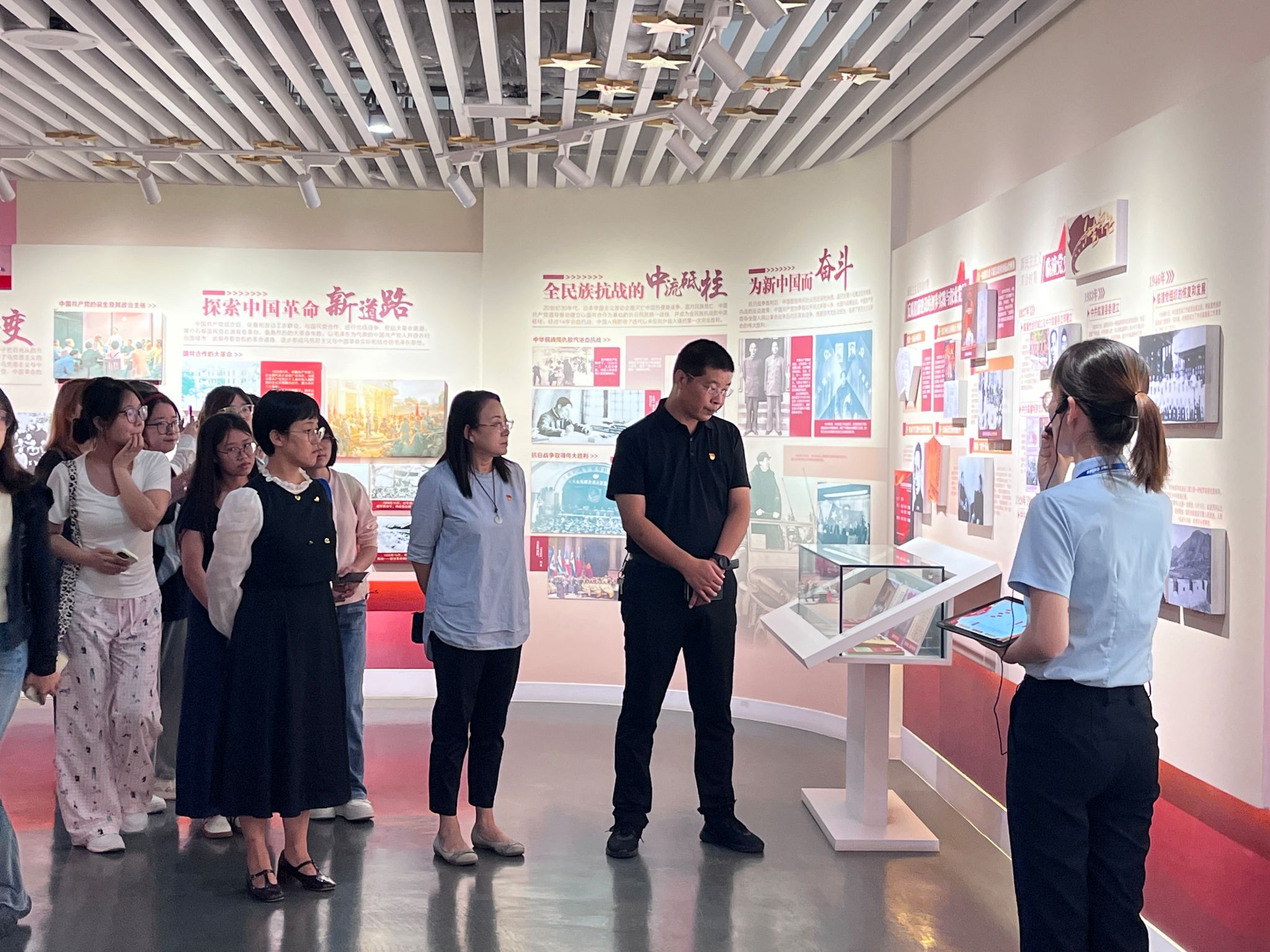 在基地讲解员的带领下,全体党员依次参观了序厅、初心厅、知畏厅和使命厅四个展厅。展览通过丰富的形式,包括主题展板、历史图片、文字资料、三维情景展示以及视频再现等,生动呈现了中国共产党百年来的光辉历程与伟大成就,特别是党在自我革命过程中坚定理想信念、不忘初心使命的具体实践。