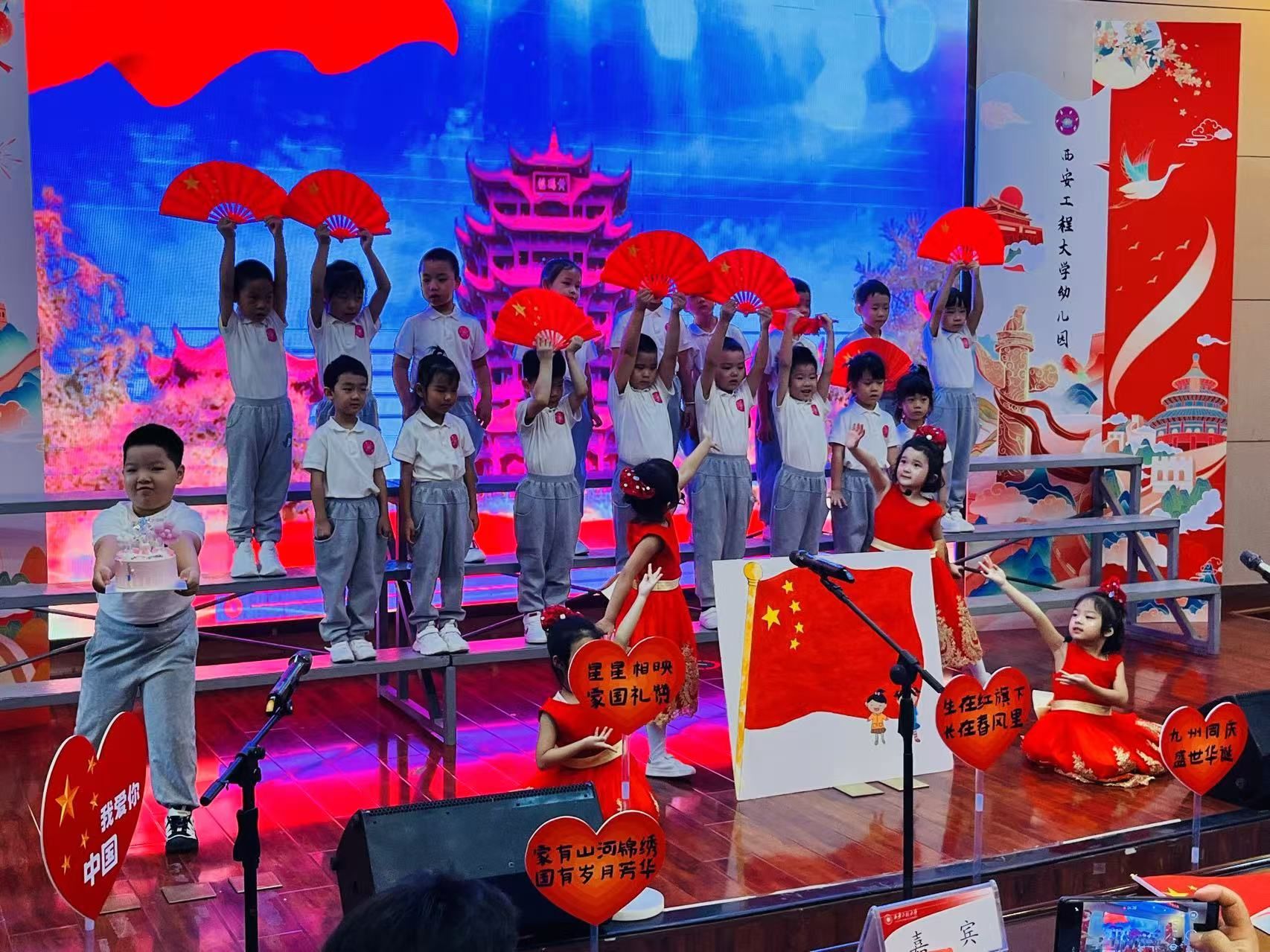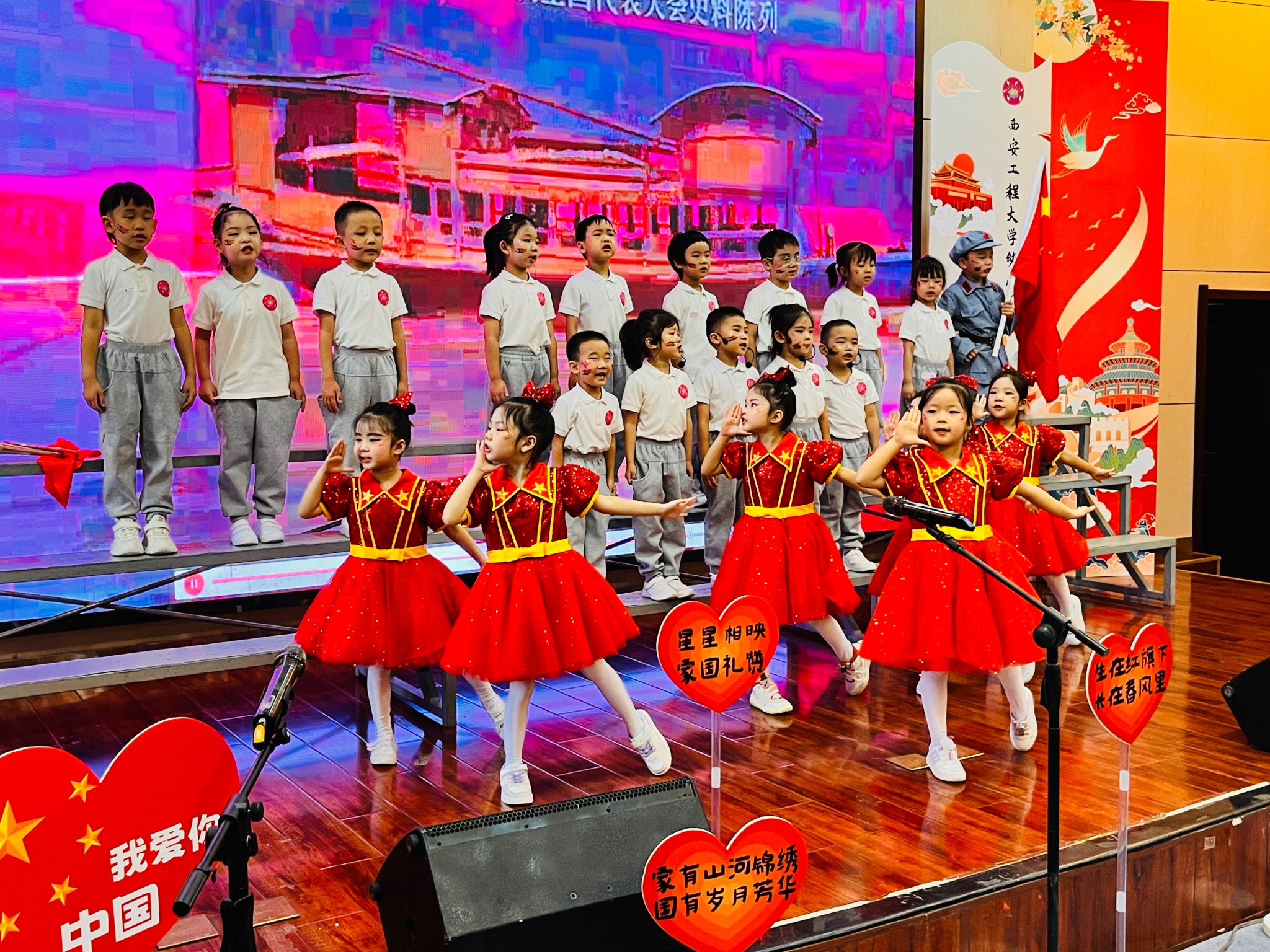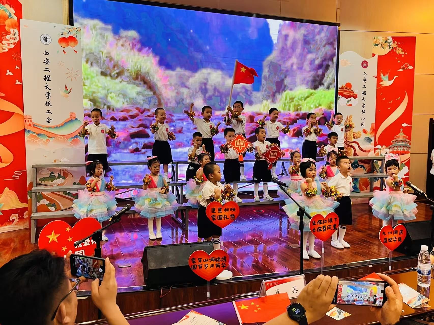 西纺报告厅内气氛热烈,小朋友们身着节日的盛装,和家长们挥动五星红旗,脸上洋溢着欢乐的笑容,喜迎祖国妈妈的生日。活动在歌曲《小孩子大梦想》《红船新一代》大二班小朋友们嘹亮的歌声中拉开帷幕,接着,大、中、小班孩子们用稚嫩而坚定的声音传唱了《党是太阳我是花》《红红的太阳》《祖国祖国我们爱你》等12首耳熟能详的红色经典歌曲。孩子们用歌声传递着对党、对祖国最纯真的爱,用歌声祝福祖国75周年华诞,用歌声抒发心中的幸福和自豪,展现出了新时代幼儿朝气蓬勃的精神风貌。最后,合唱《我和我的祖国》将活动推向了高潮,全场师生、家长同唱一首歌,爱国的情感在每一个人心中传递。