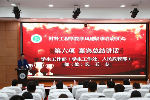 王志部长在总结发言中首先对材料工程学院近年的学风建设工作表示肯定,同时介绍了学校目前“一站式”各项工作的推进和开展情况。他希望学院继续突出特色,依托一站式学生社区探索学风建设新路径,发挥各育人主体功能,确保活动取得实效。最后他引用习近平总书记的讲话,希望大家用脚步丈量祖国大地,用眼睛发现中国精神,用耳朵倾听人民呼声,用内心感应时代脉搏,把对祖国血浓于水、与人民同呼吸、共命运的情感贯穿学业全过程、融汇在事业追求中。