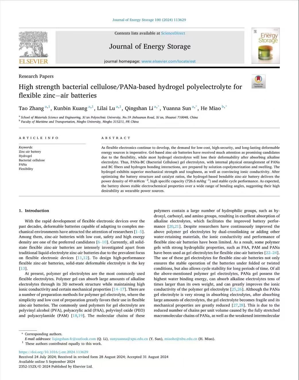 近日,beat365材料工程学院2021级材料科学与工程专业本科生张涛以题为《High strength bacterial cellulose/PANa-based hydrogel polyelectrolyte for flexible zinc−air batteries》在能源&材料类期刊《Journal of Energy Storage》发表研究论文。该论文研究了 PANa-BC(细菌纤维素)凝胶电解质的特性、机械性能和电化学性能。研究发现,凝胶电解质通过 PANa 和 BC 纤维的内部物理缠结和氢键相互作用,表现出优异的机械强度、韧性和离子导电性。同时,在优化电池结构和催化剂配比后,基于水凝胶的可弯曲锌-空气电池表现出稳定的电化学特性,为可穿戴电源的研究提供了高价值的参考。