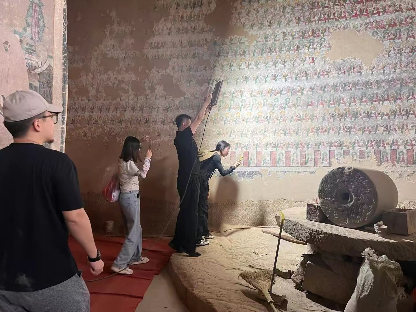 在悬空寺等处,地形崎岖,山势陡峭,部分区域甚至需要攀爬和绳降才能接近,给团队带来了不小的挑战。大家克服重重困难,利用摄影、三维扫描等技术对内部壁画进行了全方位的采集和记录,为后续的数字化保护工作积累了大量素材。团队队长、新媒体艺术学院2023级广播电视专业硕士研究生杜英捷说:“我很荣幸能够在传统文化遗产和现代数字化技术的交融中为榆林壁画艺术的保护出一份力,脚上沾满黄土,让我对文化遗产保护有了更深的敬意,我深感责任与荣耀并存。团队的努力和成果,让我收获了宝贵的经验与成长,也更加坚定了我们为保护和传承传统文化贡献力量的决心。”