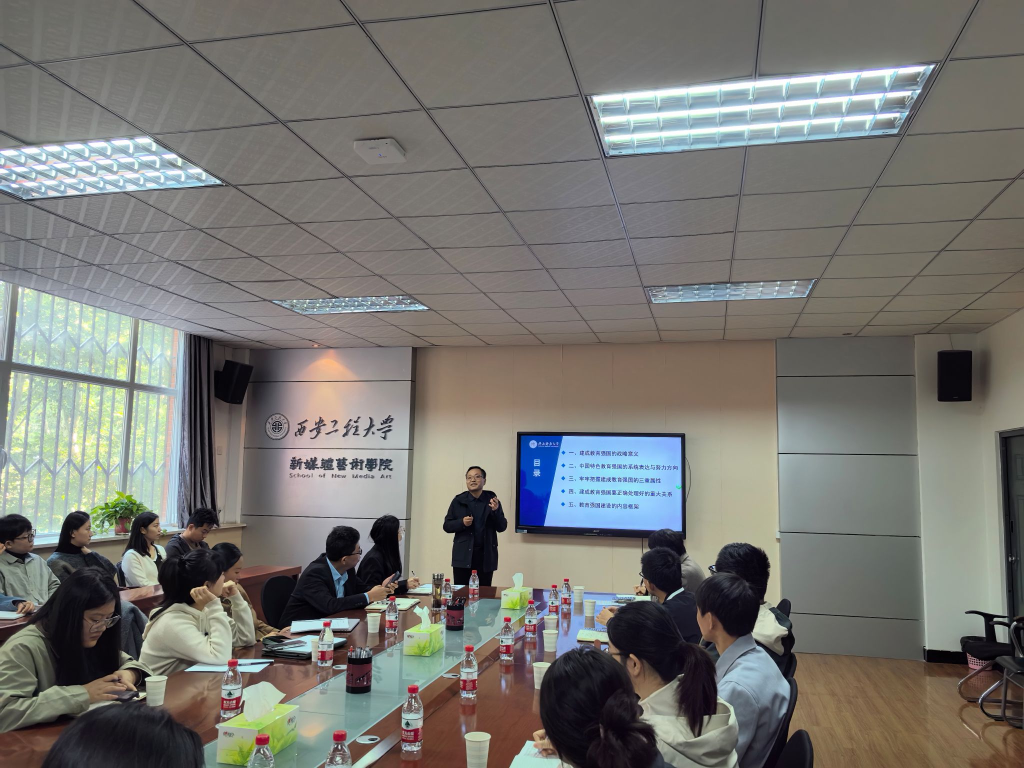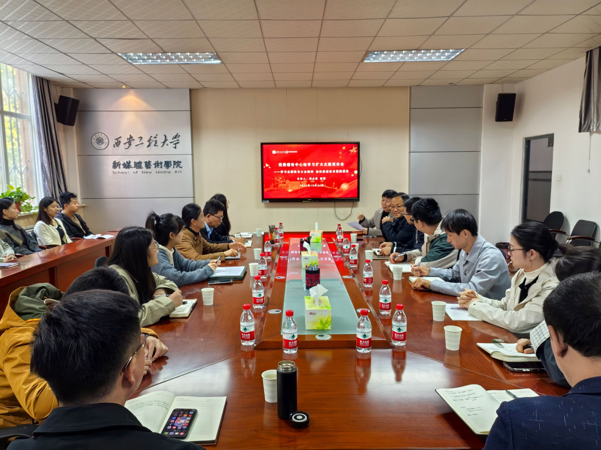 10月24日,新媒体艺术学院在金花校区8号楼326会议室召开党委理论学习中心组扩大会议,学院邀请陕西师范大学祁占勇教授作题为《学习全国教育大会精神 加快推进教育强国建设》的报告。学院党委委员、领导班子成员、党支部书记、教师及学生党员代表等30余人参加了报告会。会议由学院副院长丛红艳主持。