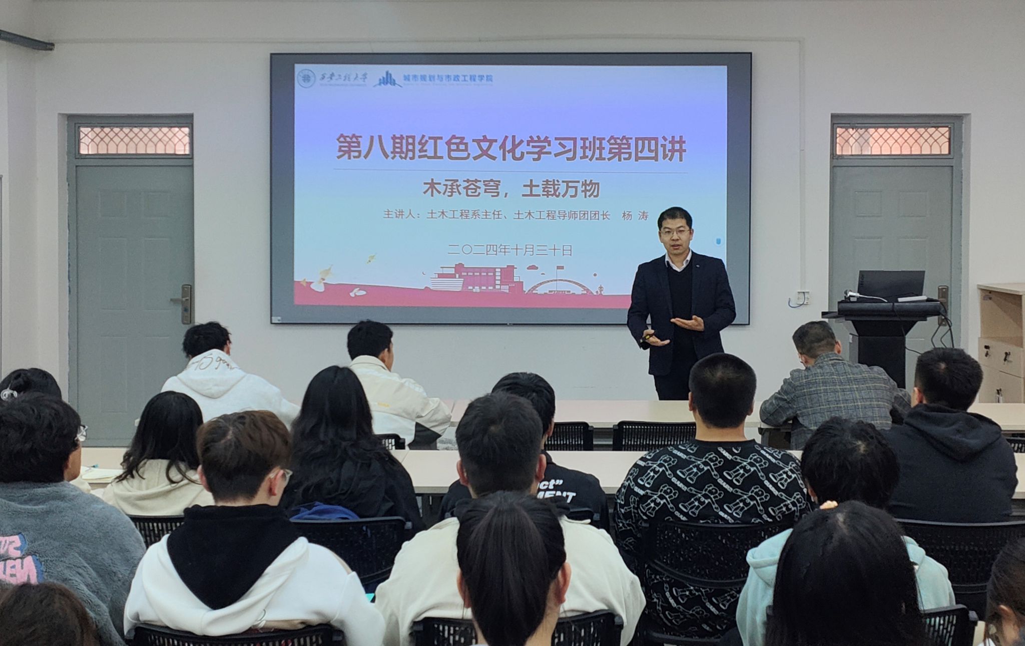 10月30日下午,城市规划与市政工程学院第八期红色文化学习班第四讲在学院322报告厅开讲。第四讲邀请土木工程系主任、土木工程专业“三全育人导师团”团长杨涛副教授主讲,学习班班长王春元及全体学员参加了学习。