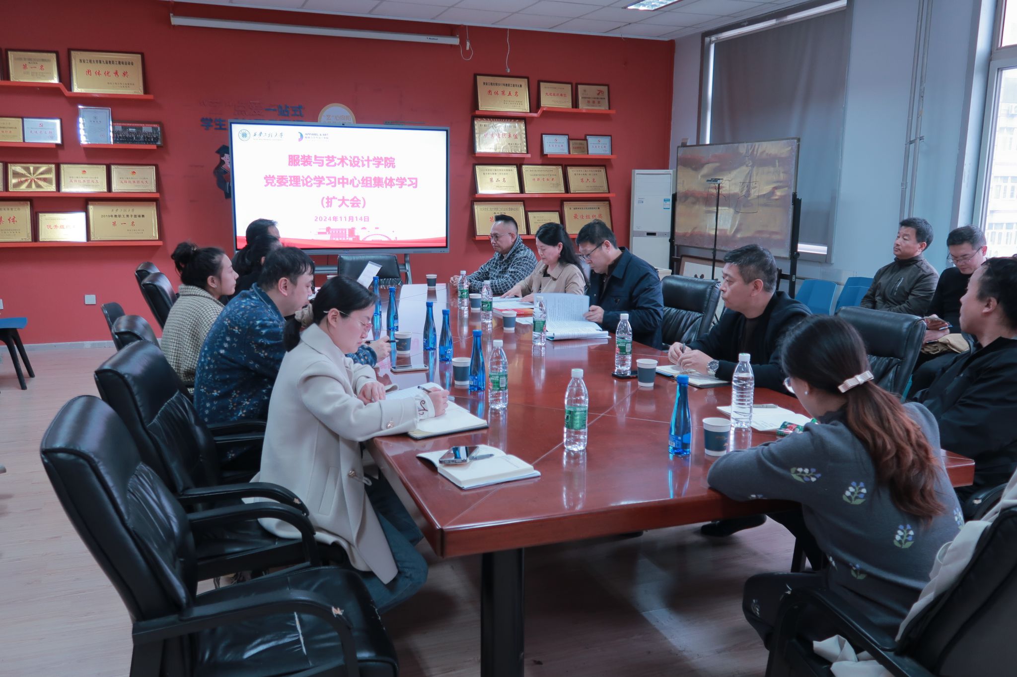 11月14日下午,服装与艺术设计学院党委理论学习中心组在金花校区召开集体学习(扩大)会,深入学习贯彻党的二十届三中全会精神和全国教育大会精神,学院党委理论学习中心组全体人员、科级以下干部、全体党支部书记参加学习会。