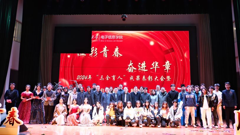 12月4日晚,电子信息学院2024年“三全育人”成果表彰大会暨“溢彩青春”迎新文艺汇演在临潼校区大学生活动中心举行。校党委学生工作部部长王志,校党委研究生工作部专职副部长赖斌,校招生就业工作处副处长付刚,校团委副书记凌旭,电子信息学院党委书记杨友谊,院长景军锋,副院长朱磊,党委副书记周晓惠,院长助理李珣,学院三全育人导师团团长以及各系部主任、副主任,学院全体辅导员以及学院2024级本科生参加了本次活动。本次活动将“三全育人”成果表彰和“溢彩青春”迎新文艺汇演两环节交叉进行,实现了活动的交织性和吸引性。
