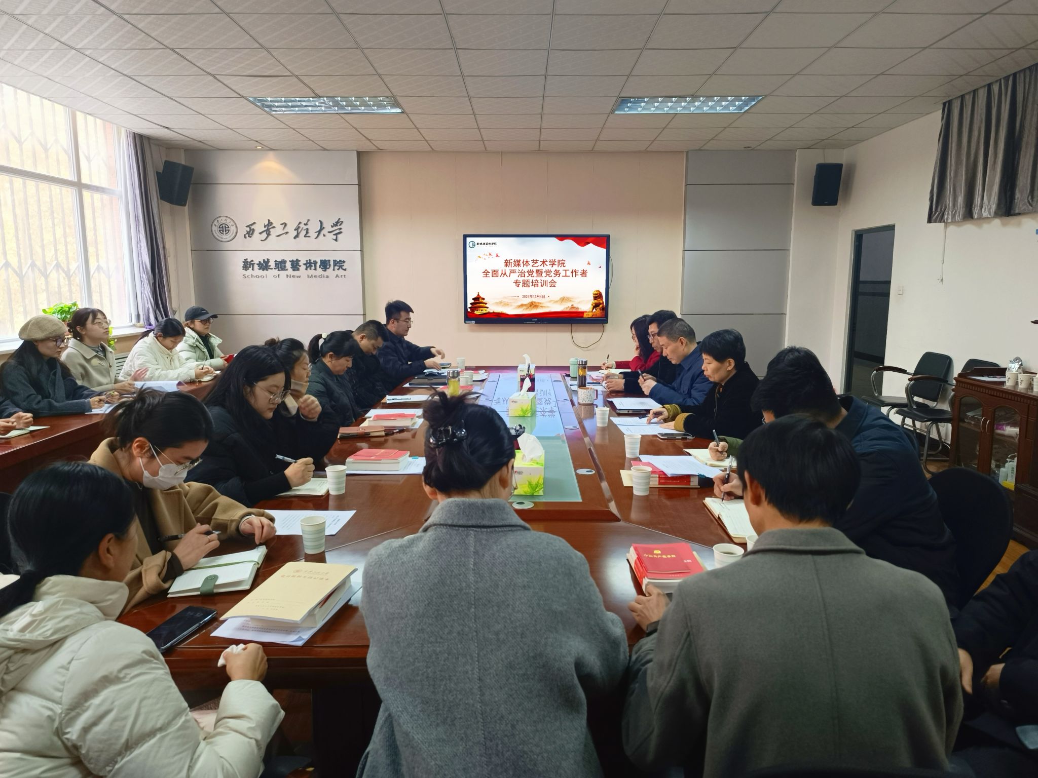 12月4日,新媒体艺术学院在金花校区8号楼326会议室召开2024年全面从严治党暨党务工作者专题培训会。全体院领导、党支部书记及委员参加会议。会议由院党委副书记赵文熙主持。