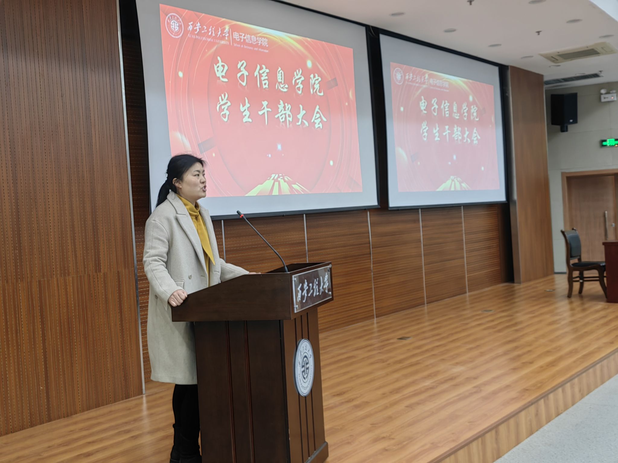12月11日,电子信息学院在图书馆二楼报告厅组织召开全体学生干部大会,学院党委副书记周晓惠、全体辅导员及本科生所有班级委员参加会议,会议由学院学生工作办公室主任王德利主持。