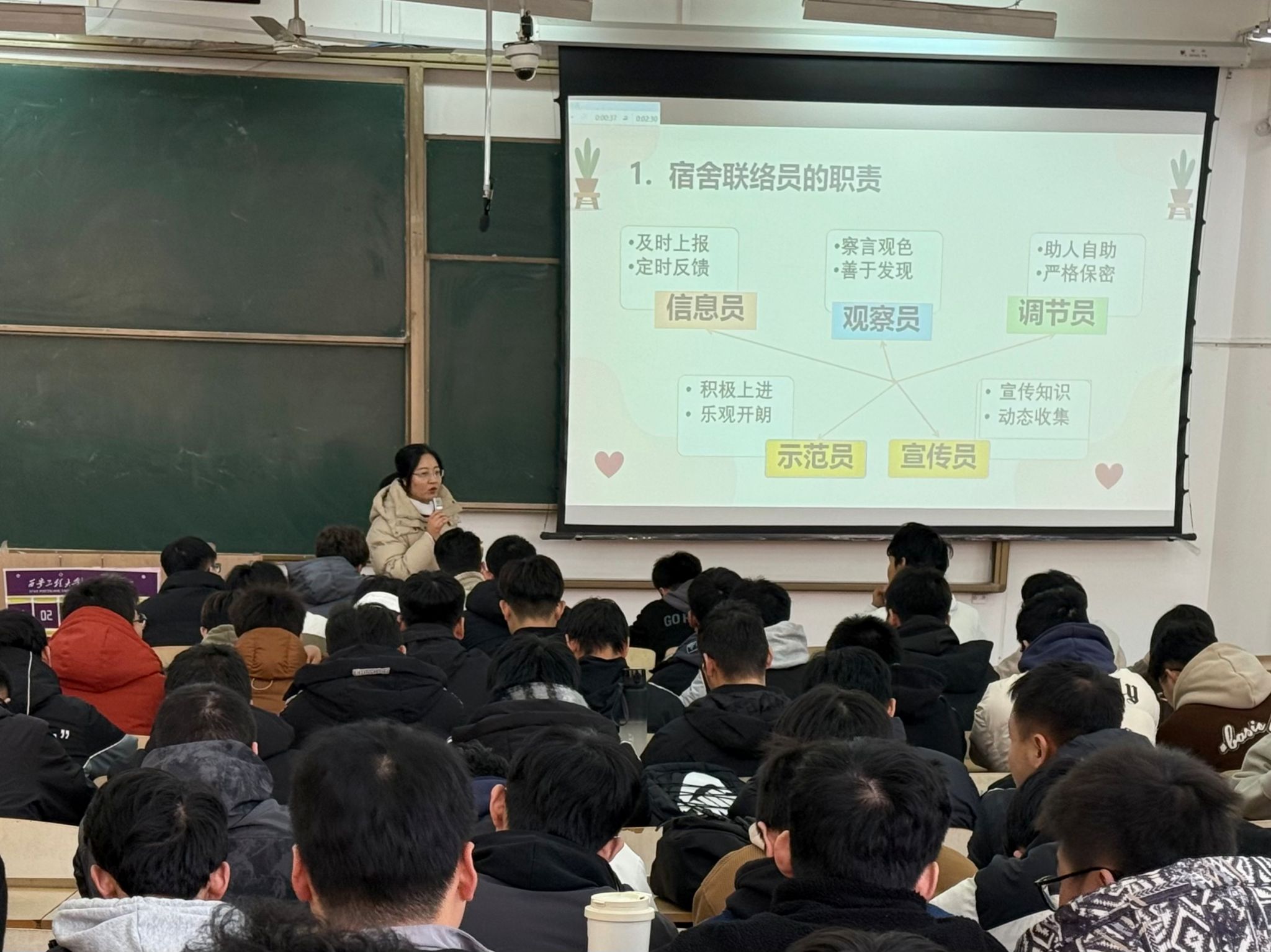 田珍珍以“看见你、走近你、温暖你”为主题,从觉察与识别、沟通与连接、支持与关怀三方面,为大家讲解如何在宿舍中关注同学们的心理健康,如何进行有效的心理沟通与疏导,帮助大家营造一个积极健康、充满关爱的宿舍心理环境。刘洋以消防安全、用电安全、防盗安全为重点,通过分享高校典型案例,详细解读了防火用电的相关规定和注意事项,并传授安全防范技巧和应急处理方法。秦方刚通过学校实际案例,讲解了“和美宿舍”建设的目标意义,强调发挥联络员的桥梁纽带作用,以实际行动带动宿舍成员,共同营造和谐美好的宿舍氛围。
