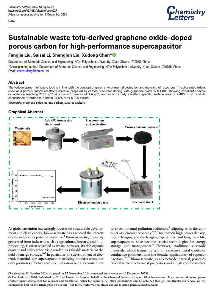 近日,材料工程学院2022级材料科学与工程专业本科生刘方杰以“Sustainable waste tofu-derived graphene oxide–doped porous carbon for high-performance supercapacitor”为题在化学综合类期刊“Chemistry Letters”发表研究论文。该论文研究了以废弃生物质作为碳前驱体,通过掺杂氧化石墨烯制备了石墨烯多孔碳电极材料。实验结果表明:掺杂氧化石墨烯后的多孔碳材料表现出优异的电化学性能,为新型超级电容器的设计和制造提供了新思路。