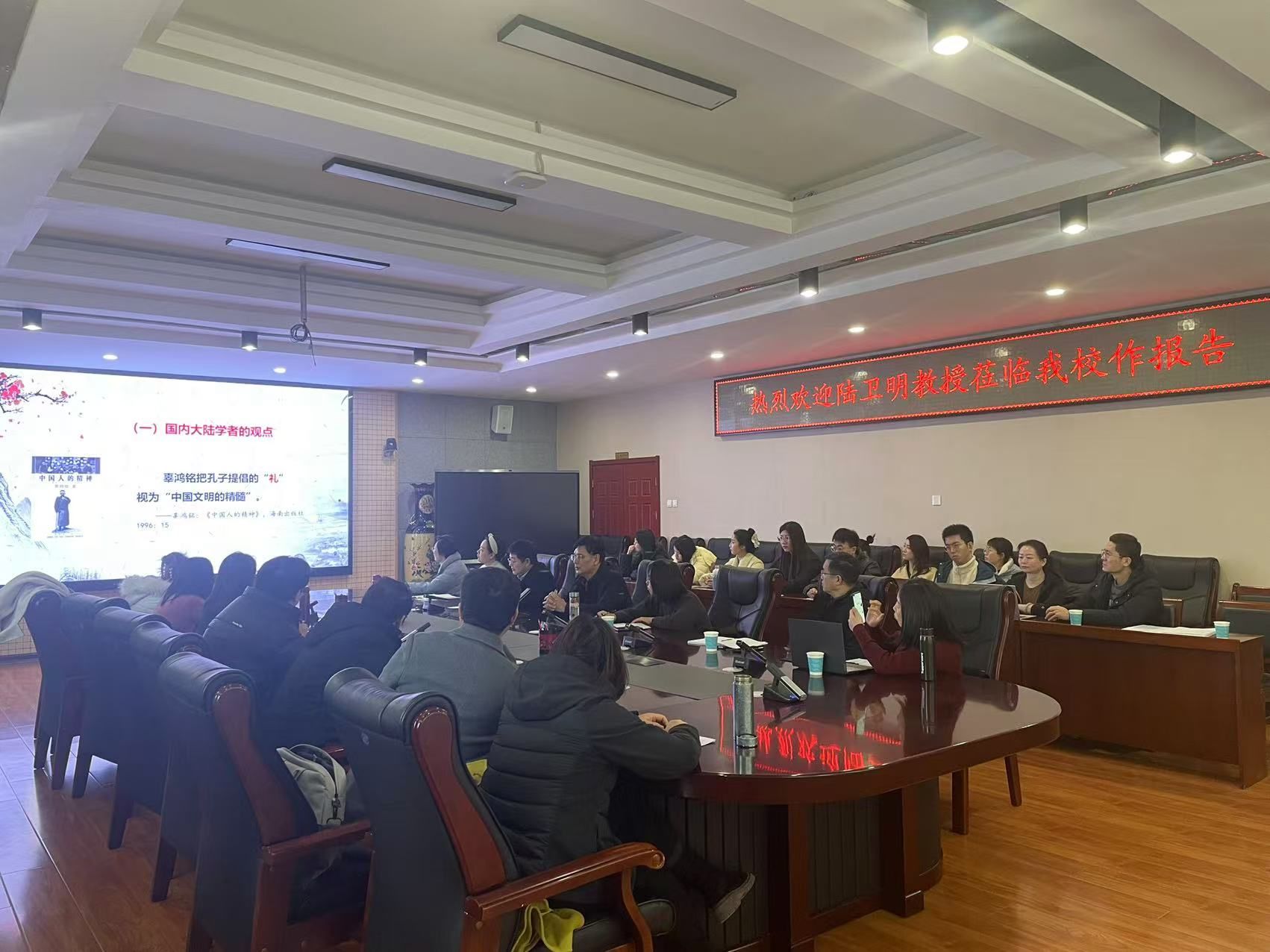 12月19日上午,马克思主义学院在金花校区第三会议室举办专题报告会,特邀西安交通大学马克思主义学院、全国高校思政课名师工作室(西安交通大学)负责人、国家重大课题负责人,中国马克思主义研究所所长陆卫明教授作了题为“中华文明的精神标识与文化精髓一一兼谈国家社科基金项目申报”的主题报告,马克思主义学院党委副书记傅博娜、副院长郭松、副院长屈旻以及各教研室教师、研究生代表共50余人参加,本次报告由郭松主持。