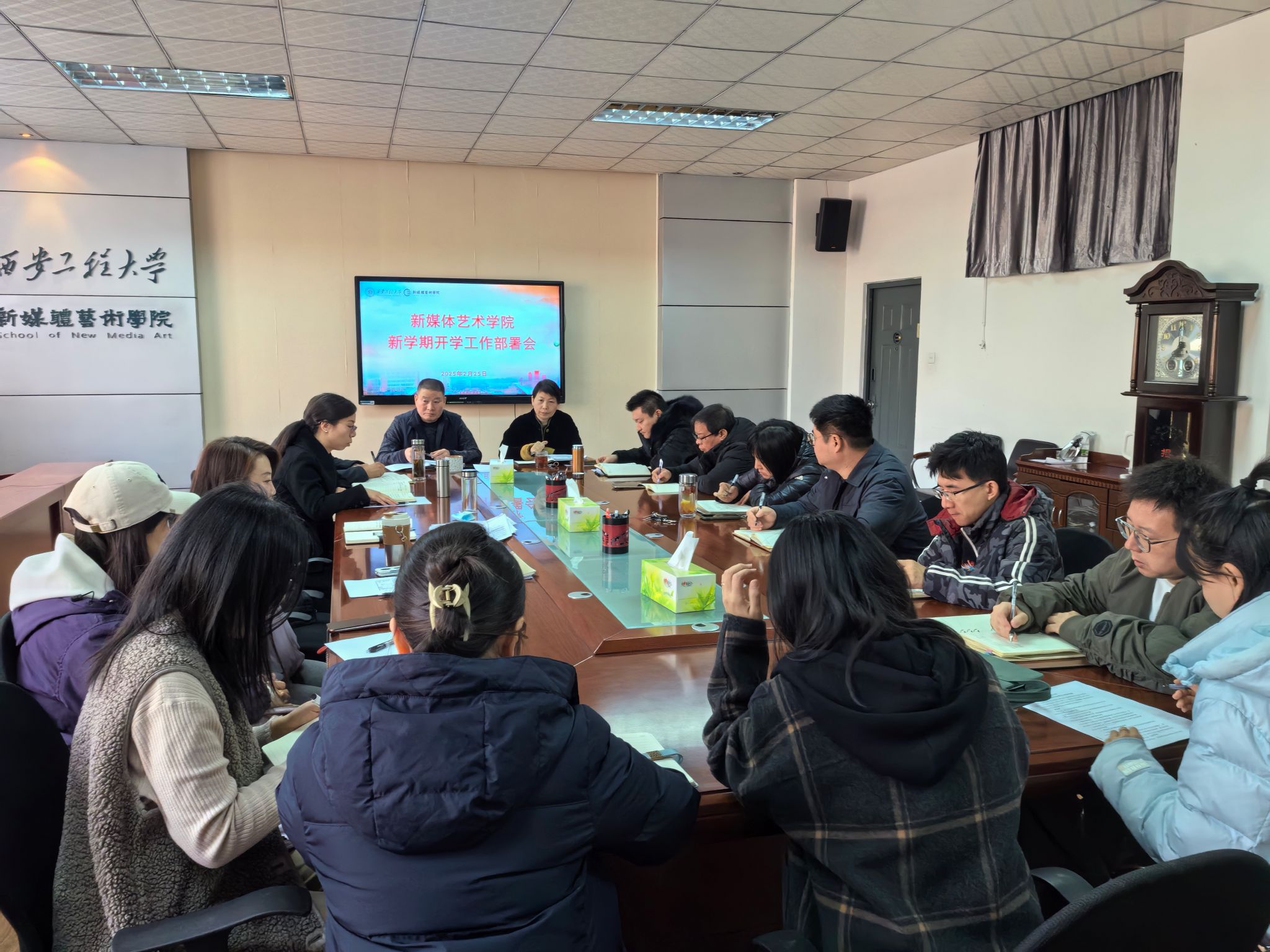 2月25日上午,新媒体艺术学院在金花校区8-326会议室召开了新学期开学工作部署会,确保开学平稳有序。学院领导班子成员、各系办正副主任及学院各个秘书等参加了会议,会议由院党委书记张瑾主持。