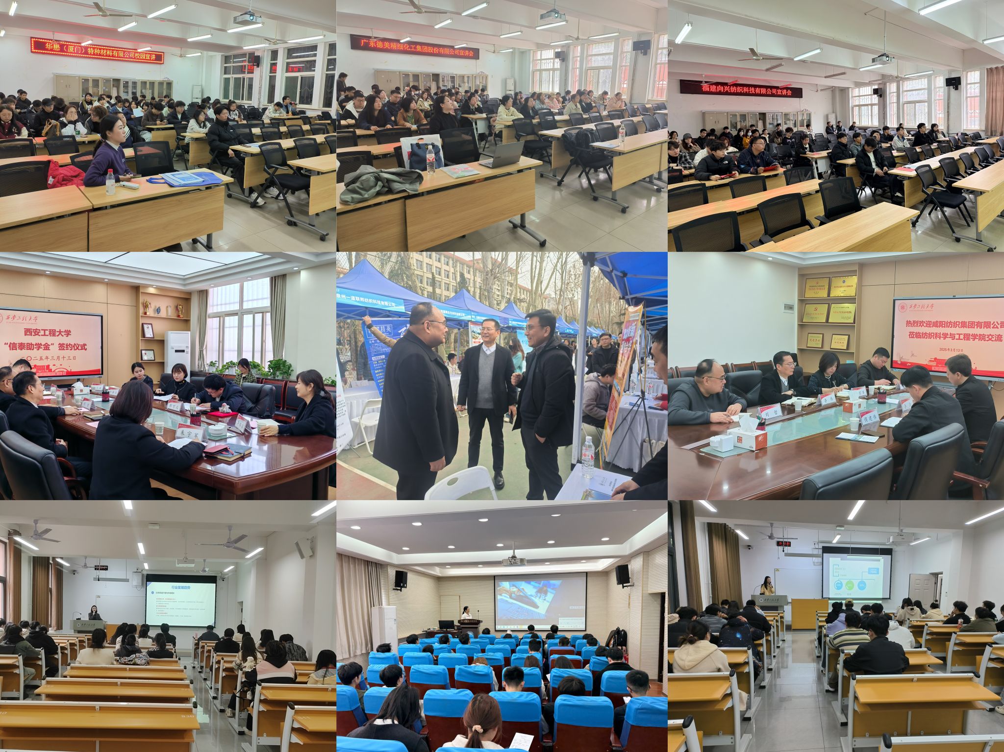 搭建平台,提高供需匹配。学院积极搭建就业平台,为毕业生和用人单位提供精准对接服务。一方面,学院积极邀请24家企业参加学校2025届毕业生春季大型招聘会,企业类型涵盖纺织、服装、机械等多个专业领域,为毕业生提供了丰富的就业岗位选择。另一方面,学院充分利用春季大招会契机,与咸阳纺织集团有限公司、信泰集团深入座谈交流,进一步深化产学研合作。同时,针对不同企业的特点和需求,邀请广东德美精细化工集团股份有限公司、珠海天威新材料股份有限公司、福建向兴纺织科技有限公司、江苏英伟医疗有限公司、广州前进牛仔布有限公司等多家企业进校开展专场招聘宣讲会,向2025届毕业生介绍企业情况、岗位需求和发展前景,进一步提高供需匹配度,促进毕业生与用人单位的双向选择。