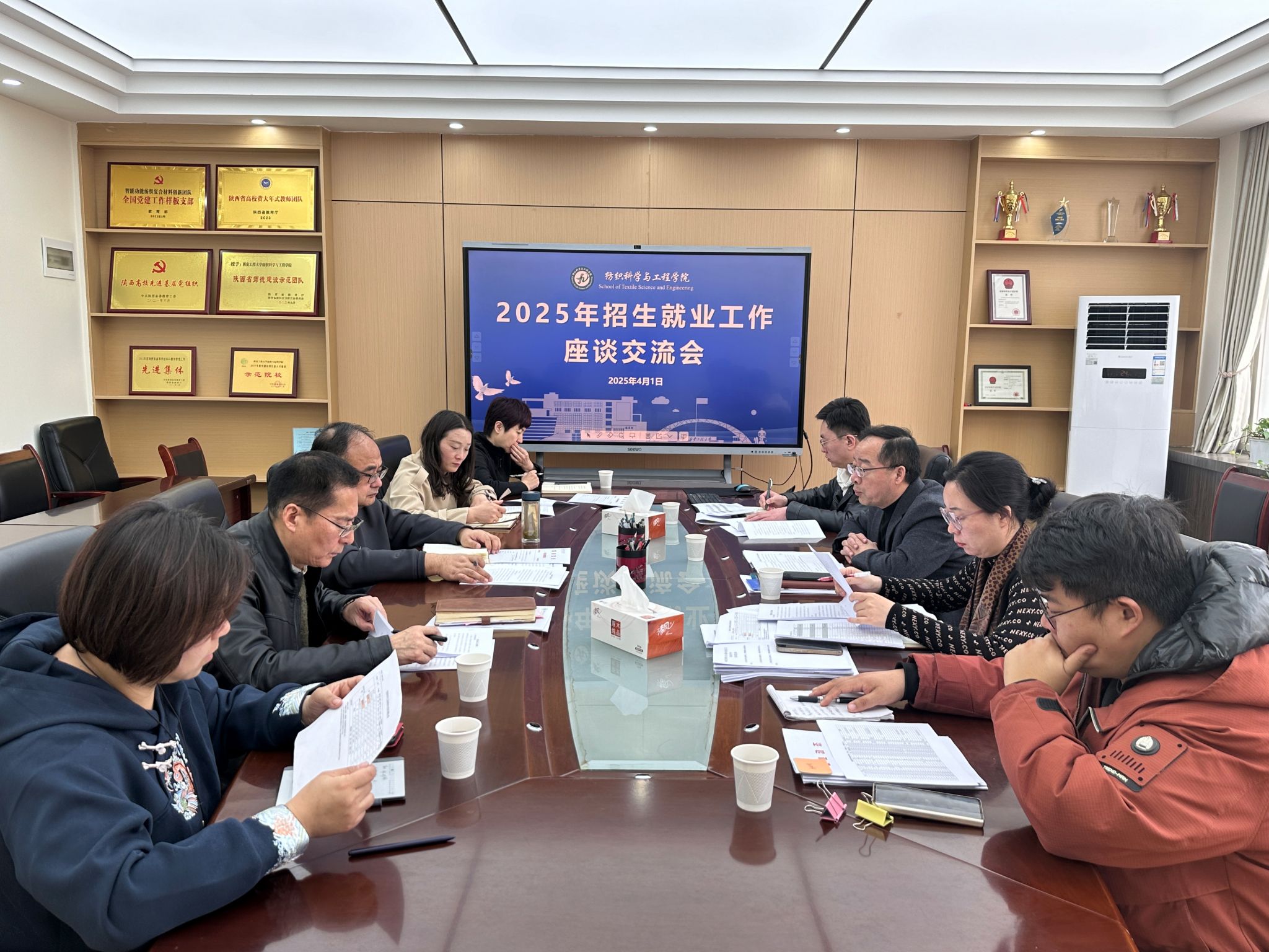 2025年4月1日,纺织科学与工程学院在金花校区举办2025年招生就业工作座谈交流会,招生就业工作处副处长付刚、刘畅,纺织科学与工程学院党委书记李伟、副书记朱宇军、副院长刘哲及相关负责人参加了会议。