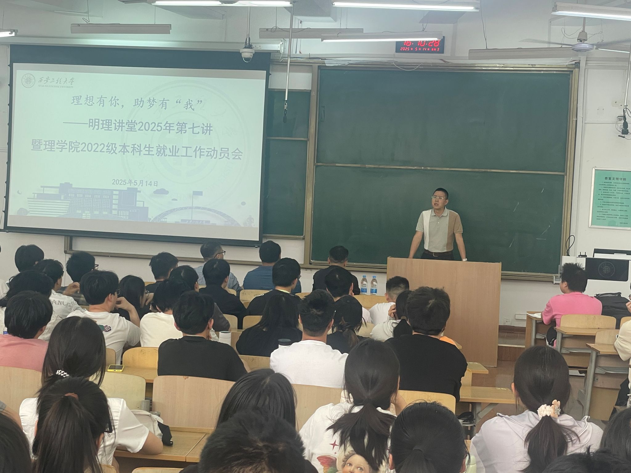 5月14日,理学院举办“理想有你,助梦有‘我’”之明理讲堂2025年第七讲暨理学院2026届本科毕业生就业工作动员会。beat3651999级校友、晟智明途(陕西)人力资源有限公司执行总经理张丹东,2006级校友、西安利信工程咨询有限公司人资部经理郝力光等受邀作专题报告。院党委副书记文毅、相关辅导员及2026届全体本科毕业生参加动员会。