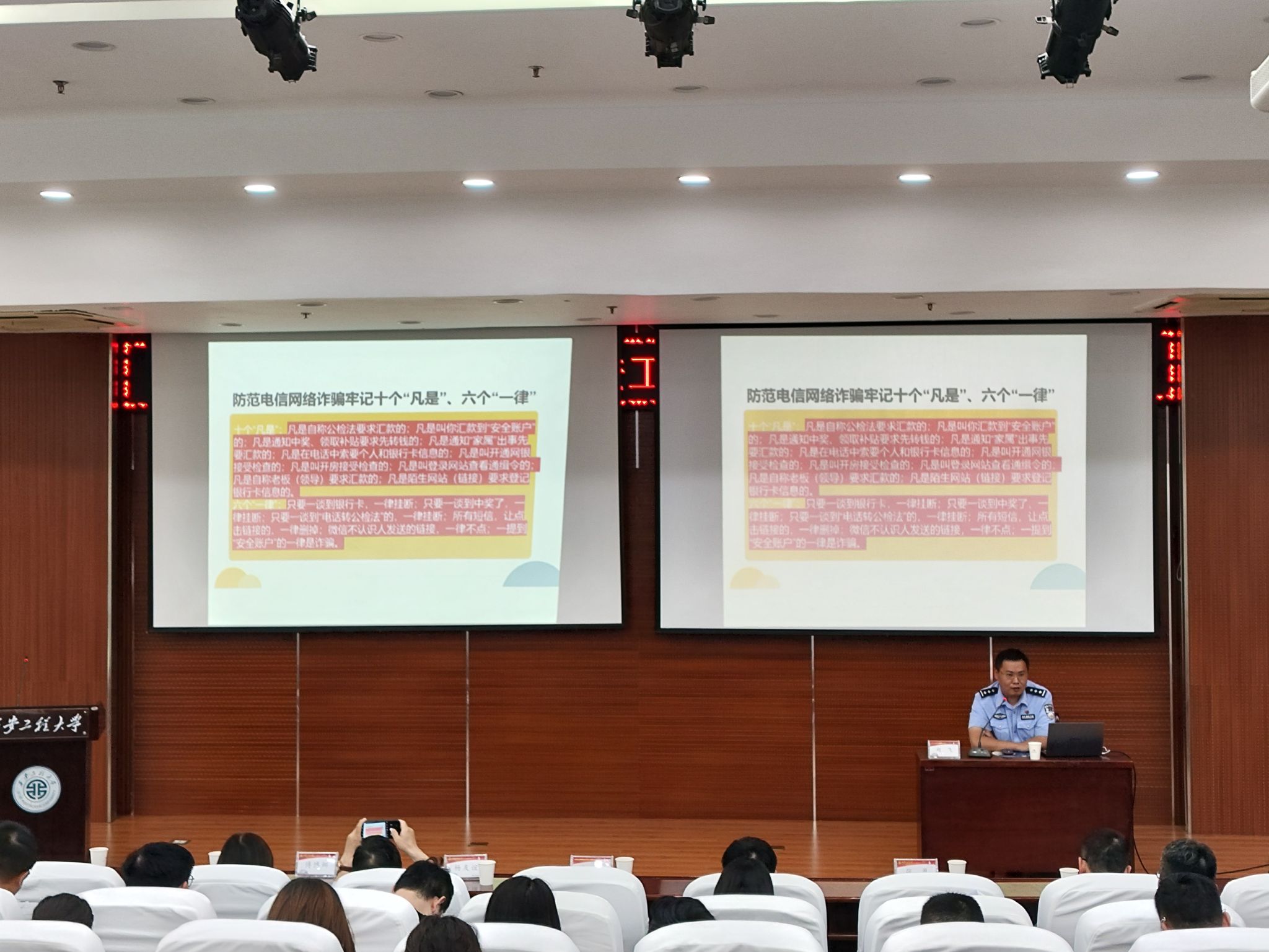 讲座现场,赵飞警官以近期发生的真实诈骗案件为切入点,结合当下电信网络诈骗的新趋势、新特点,为师生们敲响警钟。他聚焦冒充领导熟人诈骗、虚假购物诈骗、刷单诈骗、虚假贷款诈骗、冒充公检法诈骗、裸聊诈骗等六大高发诈骗类型,用生动鲜活的案例、通俗易懂的语言,将诈骗分子精心设计的话术、伪装的身份、诱导转账的套路一一拆解。同时,他还结合师生的实际生活,讲解了一些发生在身边的典型案例,给出了实用的防骗技巧和建议,让师生深刻认识到风险就在身边,务必提高防范意识,不轻易相信陌生人的话,不随意透露个人信息,不轻易点击不明链接或下载不明软件。